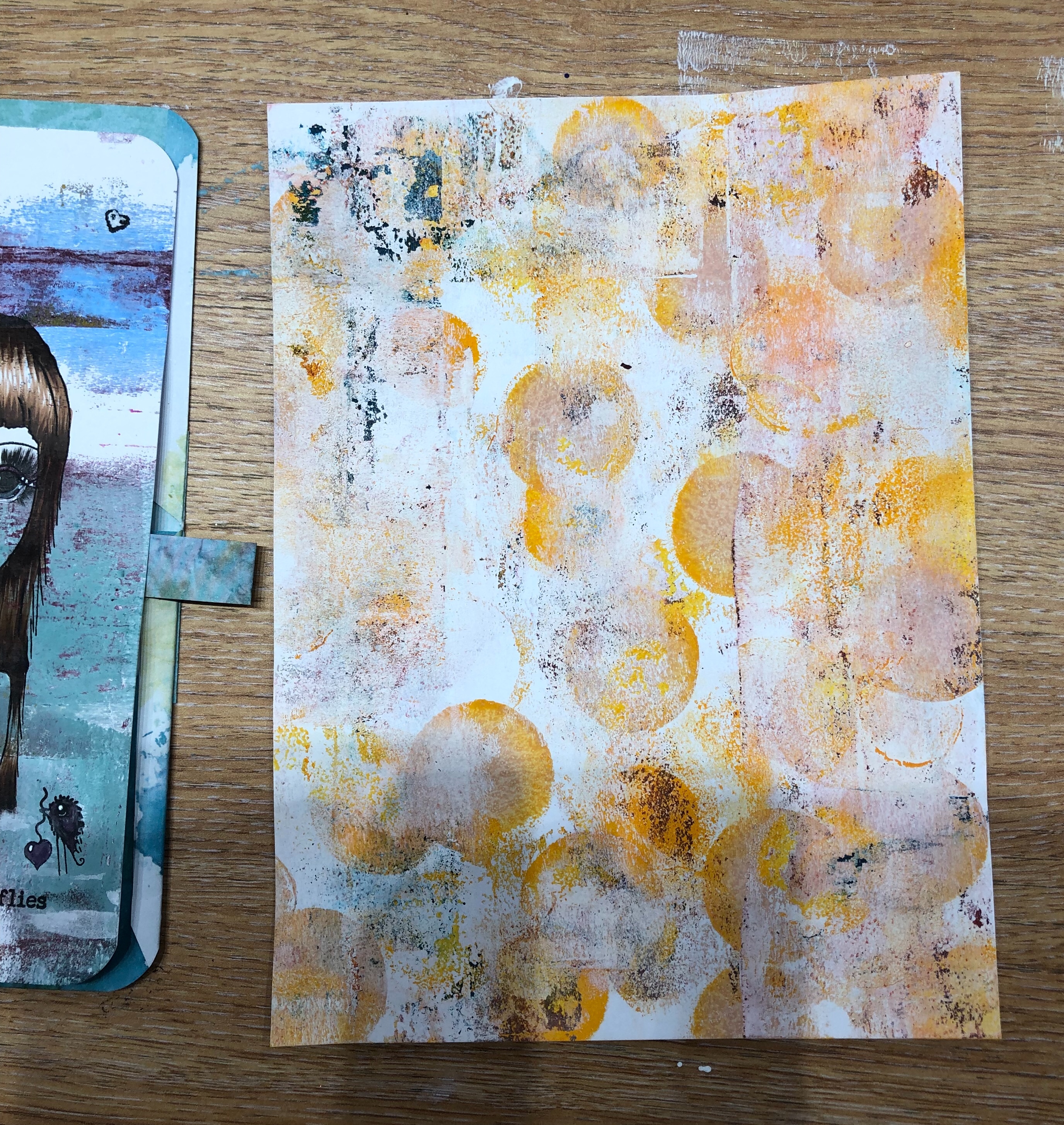 One of my Ladies has been having trouble with her Gel Plate for a couple of weeks now. No matter what paint she put on, it just stayed too wet. It was too clean and too oily. I tried to mess it up for her last Month but it didn’t work. So this Month I could see she felt it was something she was doing. So, in my mind I had two options. Offer to treat her to a new Gel Plate, or work on on her Gel Plate for a little while instead of my own. My aim is to show people how much fun they can have on the Gel Plate so I don’t want people being put off because they think they are using them in the wrong way, (basically you can’t use them in the wrong way because there IS NO wrong way with the Gel Plate).