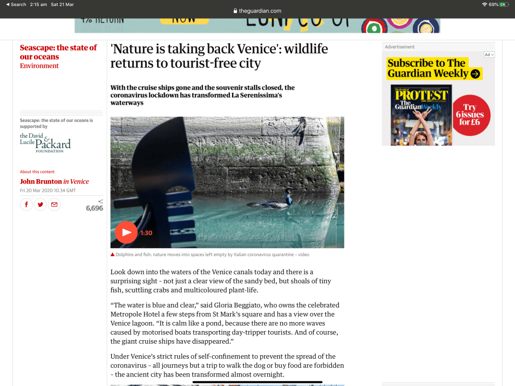 Actually on that note, today I watch footage of Venice. Someone was showing how clean all the canals had become since there were no tourist boats on it, the dregs from the bottom had settled and the water had become clean and clear and you can actually see to the bottom of the water. There are schools of fish everywhere which is quite rare on their canals. I saw footage from another Country – not sure where it was, where the Dolphins were re-appearing in the Harbours because there were no Cruise Ships there anymore. Mmm interesting isn’t it. It wouldn’t take much to clean up the Earth when you look at it that way, it almost feels like an awakening doesn’t it?