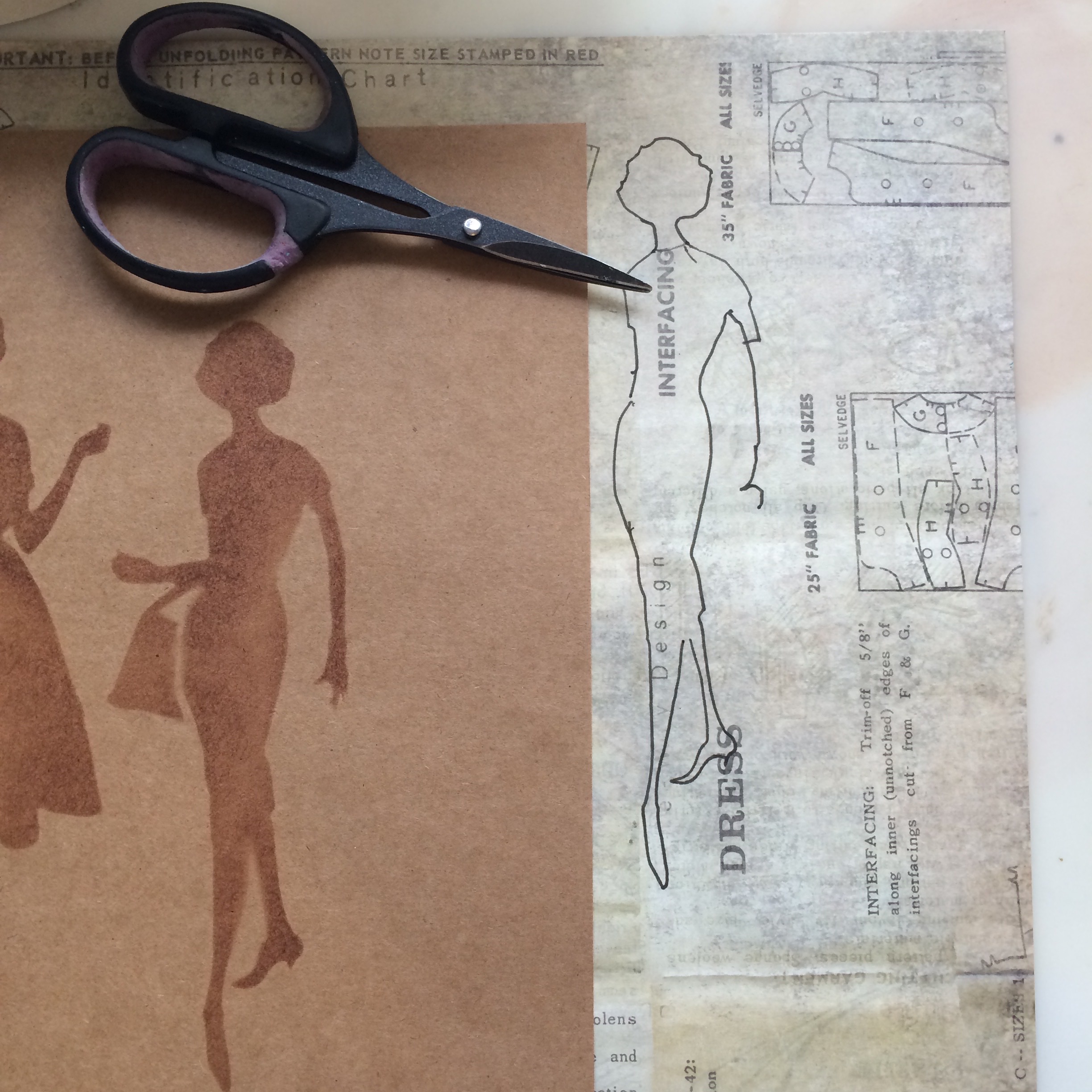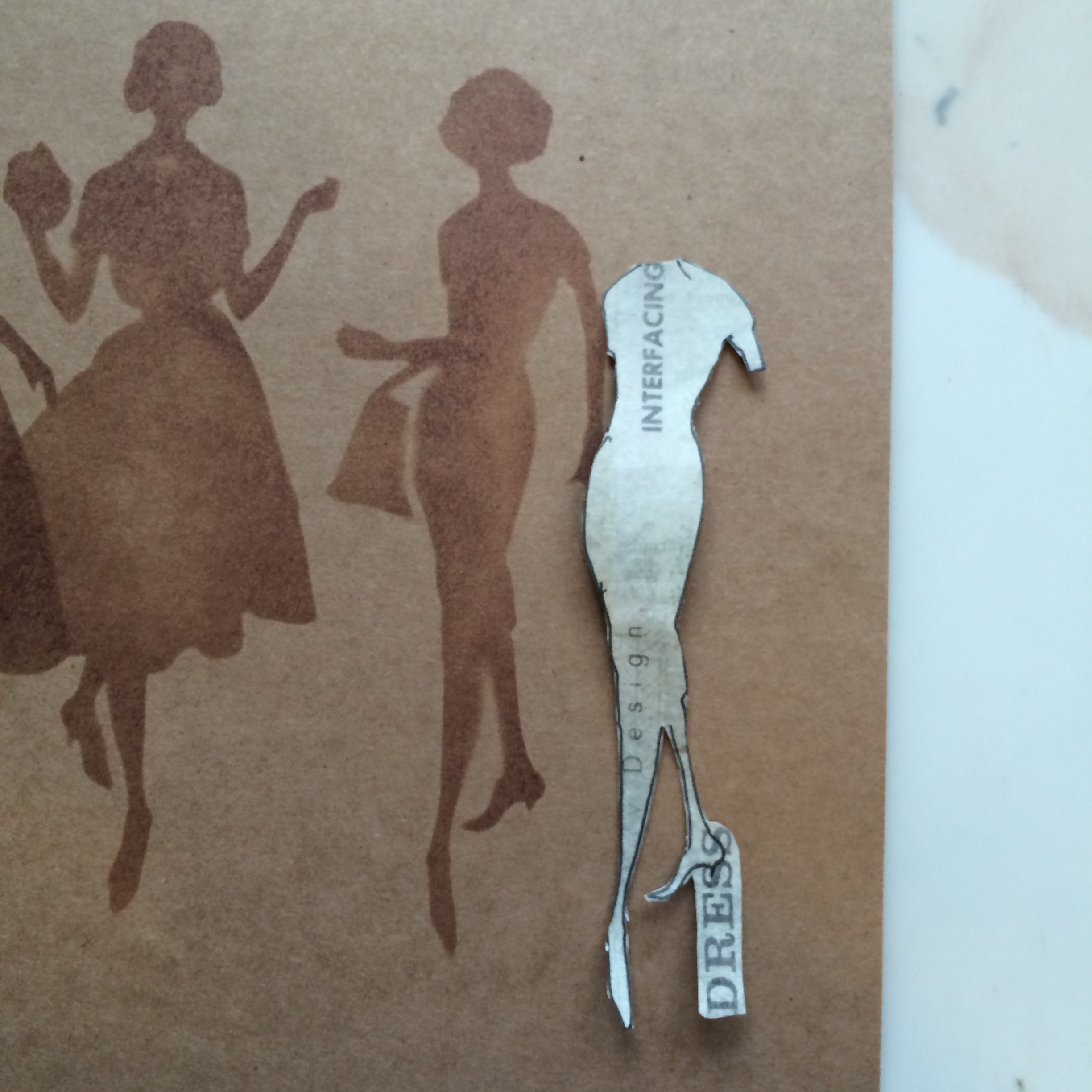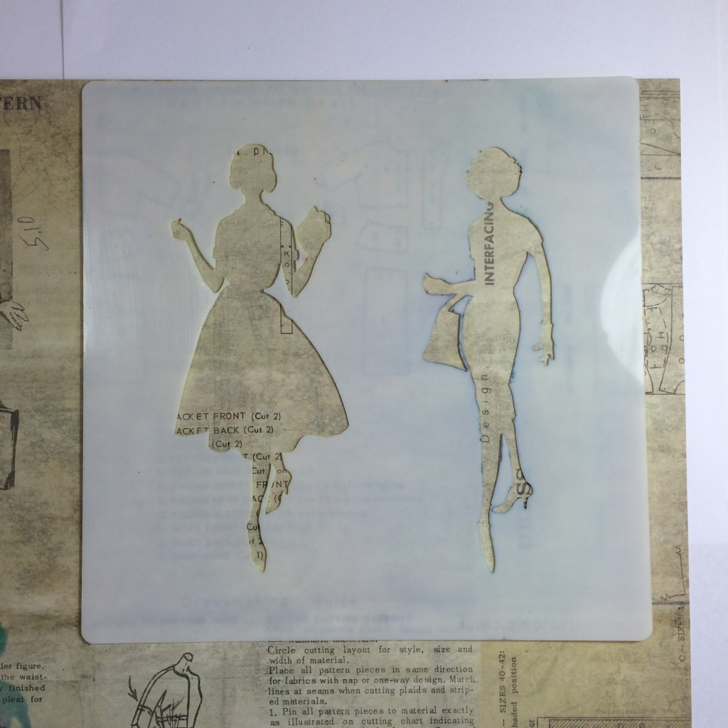 We all have 12” by 12“ Scrap Papers that we don’t use – we do don’t we!! Or Clarity Backing Papers to use. Take the Stencil and some of your favourite papers and draw through the Stencil – as above. Look for some interesting areas, like the “Design” word on the Stockings on the right, or the “Interfacing” word coming down over the dress. These bits look great when you cut them out.