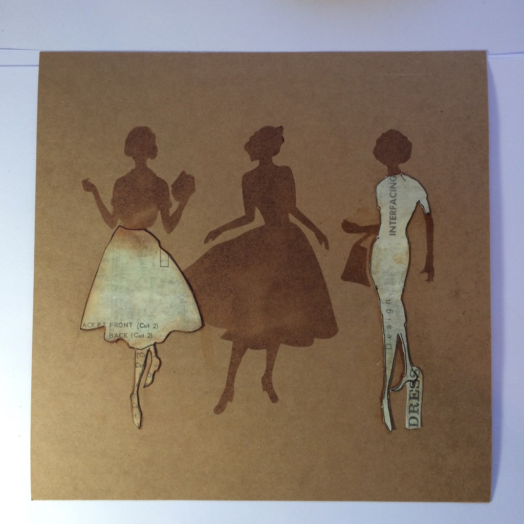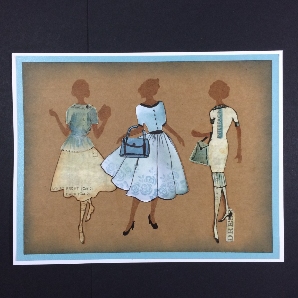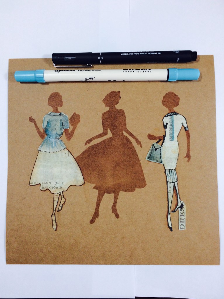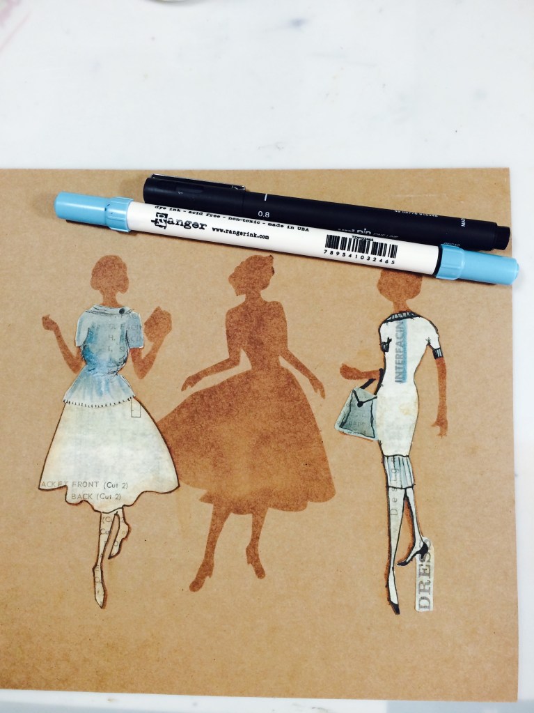 So we now have the Lady with the Self Decorated Dress, not by her, by me!!! We also have the two Ladies with the Cut out Dresses – see how I kept the Word Dress attached to her heel when I cut her out, those little interesting bits again. You could actually use Barbara Gray or Leonie Pujol’s Stickers to make an effect like this.