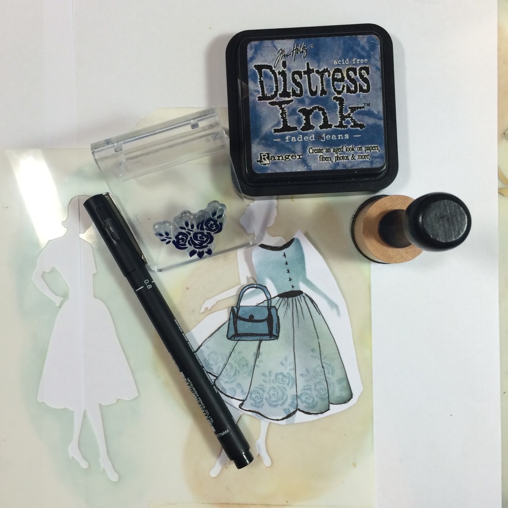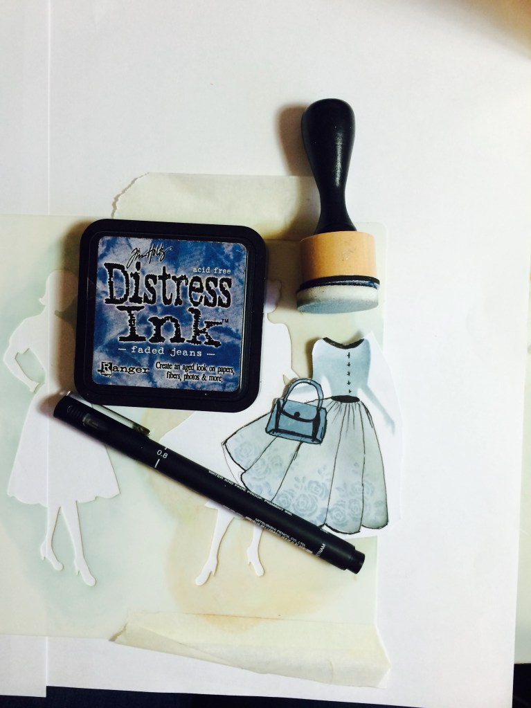 So now you get to be a Dress Designer. I have cut this one out of plain white card and used some Claritystamp’s and Distress Ink to add pattern and colour to this particular dress. She is my Centrepiece. I also doodled around the edges and added a Belt, Collar & Buttons. I love doing this.