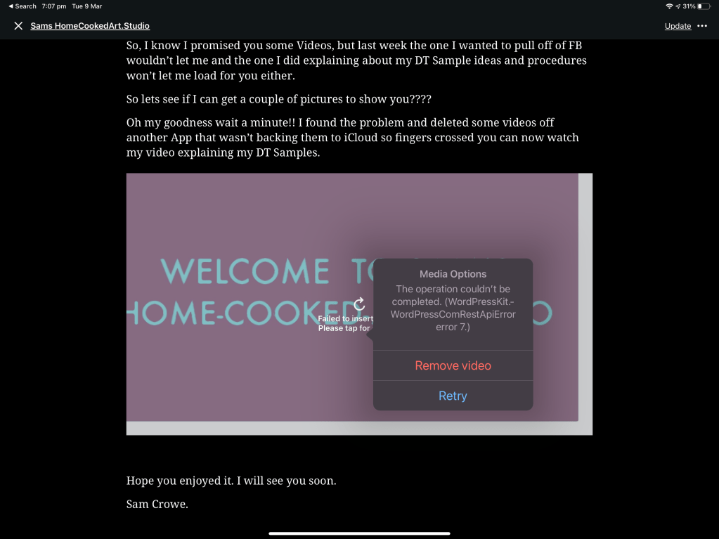 Oh my goodness wait a minute!! I found the problem and deleted some videos off another App that wasn’t backing them to iCloud so fingers crossed you can now watch my video explaining my DT Samples.