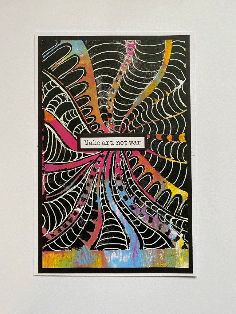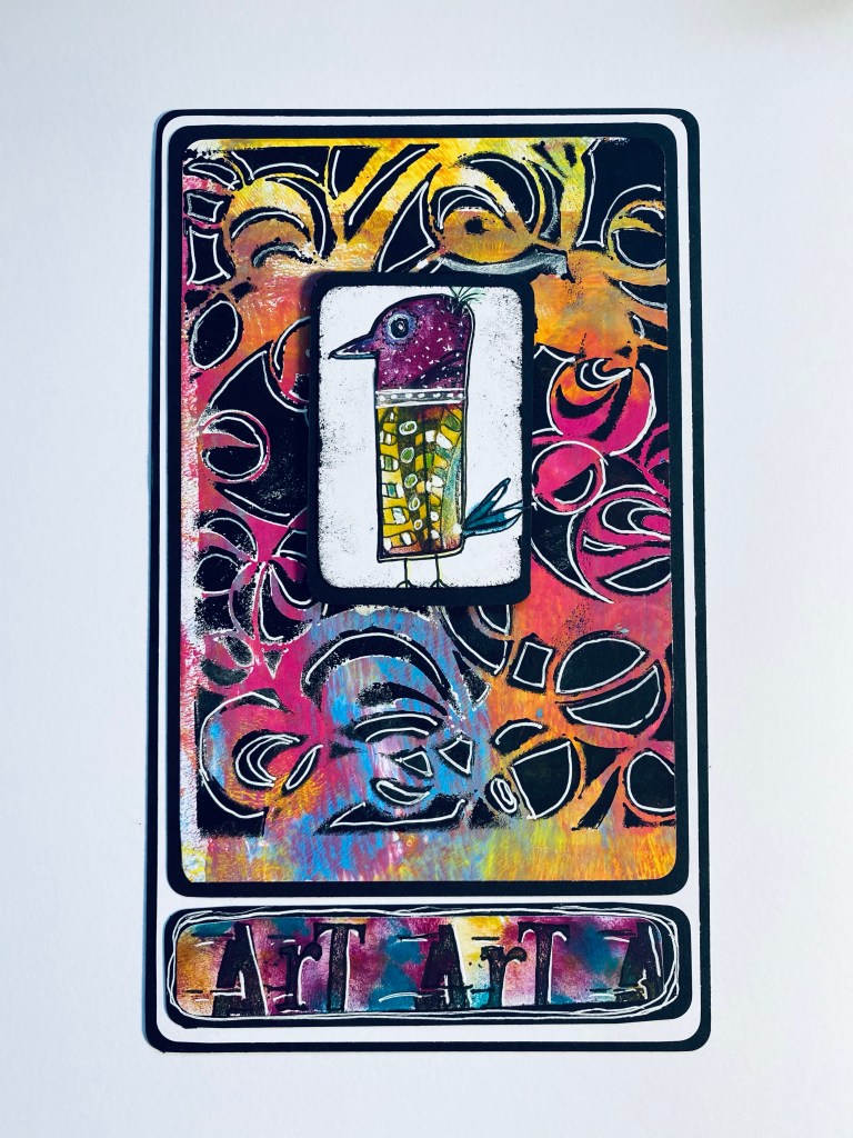 I made this after taking several prints on the GelPress Mono-printing Plate. This is one of those “last minute” Ideas I had. See when I switch off I get a little story in my head and just go with it. I do see where this could be improved, I didn’t “ground it” did I. But the ideas is what it was about.